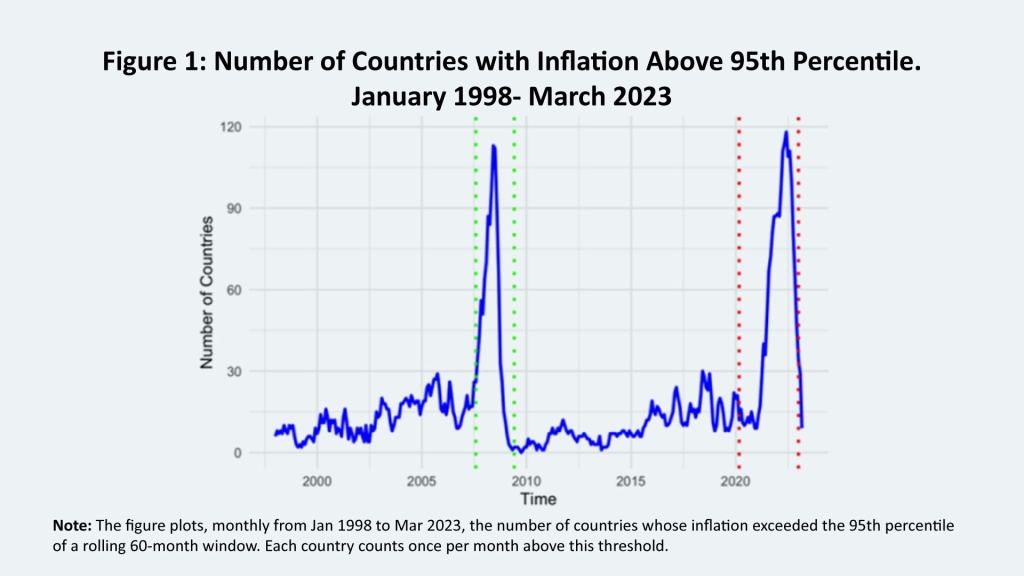 We define ‘very high inflation’ as periods where inflation surpasses a threshold relative to a country’s recent inflationary history. Specifically, year-over-year monthly inflation rates above the 95th percentile of YoY monthly inflation rates recorded over the previous five years are considered here as ‘very high’. This relative and data-driven approach is crucial for capturing the elusive and context-dependent nature of ‘high inflation,’ which naturally varies significantly across countries and over time, making fixed, absolute thresholds less effective. Our measure of very high inflation is distinct from hyperinflation, as it is inherently country-specific and unrelated to cross-country inflation levels. By dynamically adjusting to each economy’s recent experience, this definition allows for a more precise identification of episodes where central bank transparency plays a critical role in managing expectations and shortening inflationary spells. Whenever an economy is experiencing an episode of inflation above the 95th percentile of inflation rates in its recent history, we say it is experiencing very high inflation (Figure 1).